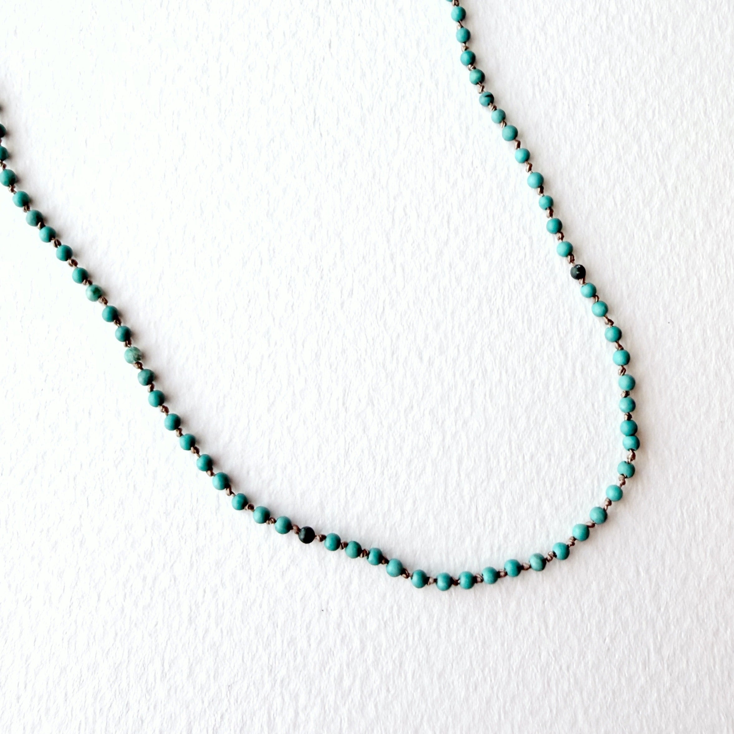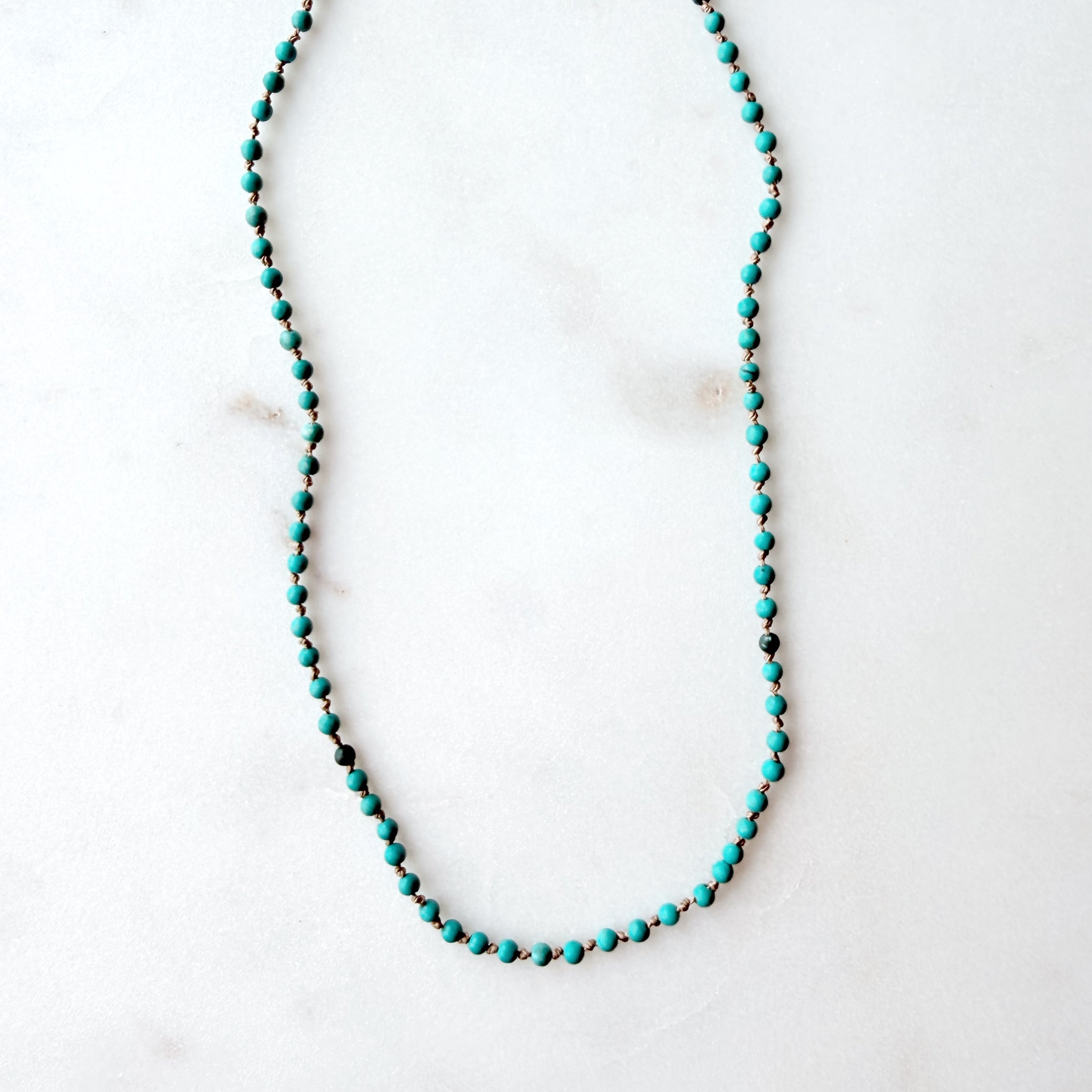 Delicate turquoise beads hand knotted on beige silk cord. Necklace measures 16 inches with a gold filled lobster clasp and two inch extender.