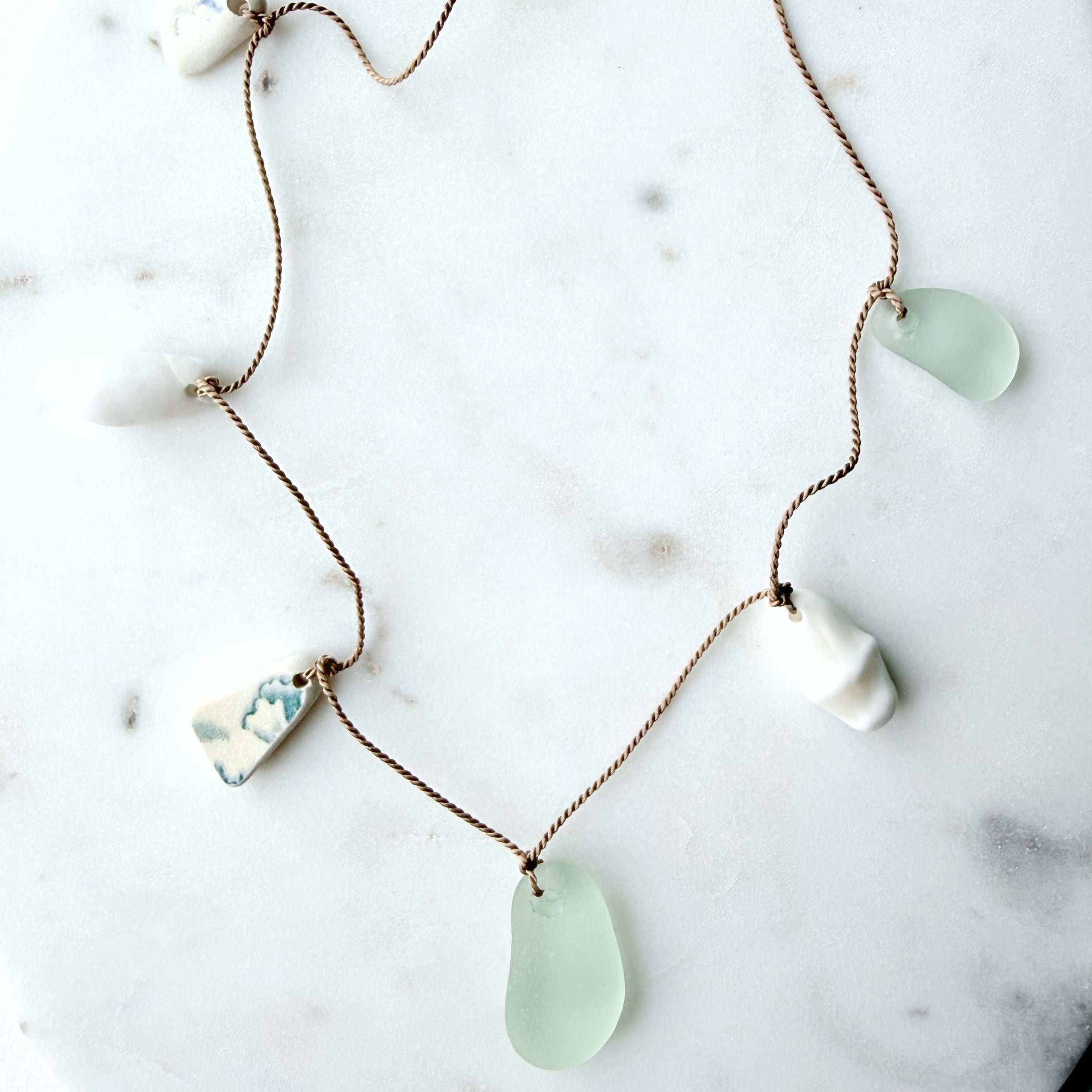 A mix of beautiful colored sea glass and shells dangling on an 18” sterling silver cable chain.
