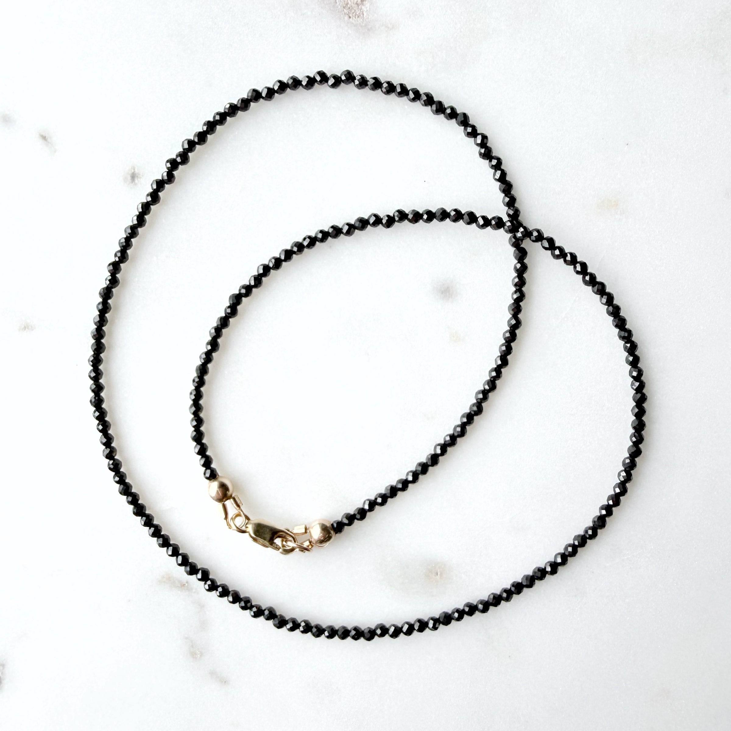 Gorgeous faceted black spinels with a gold filled lobster clasp. Measures 16 inches.